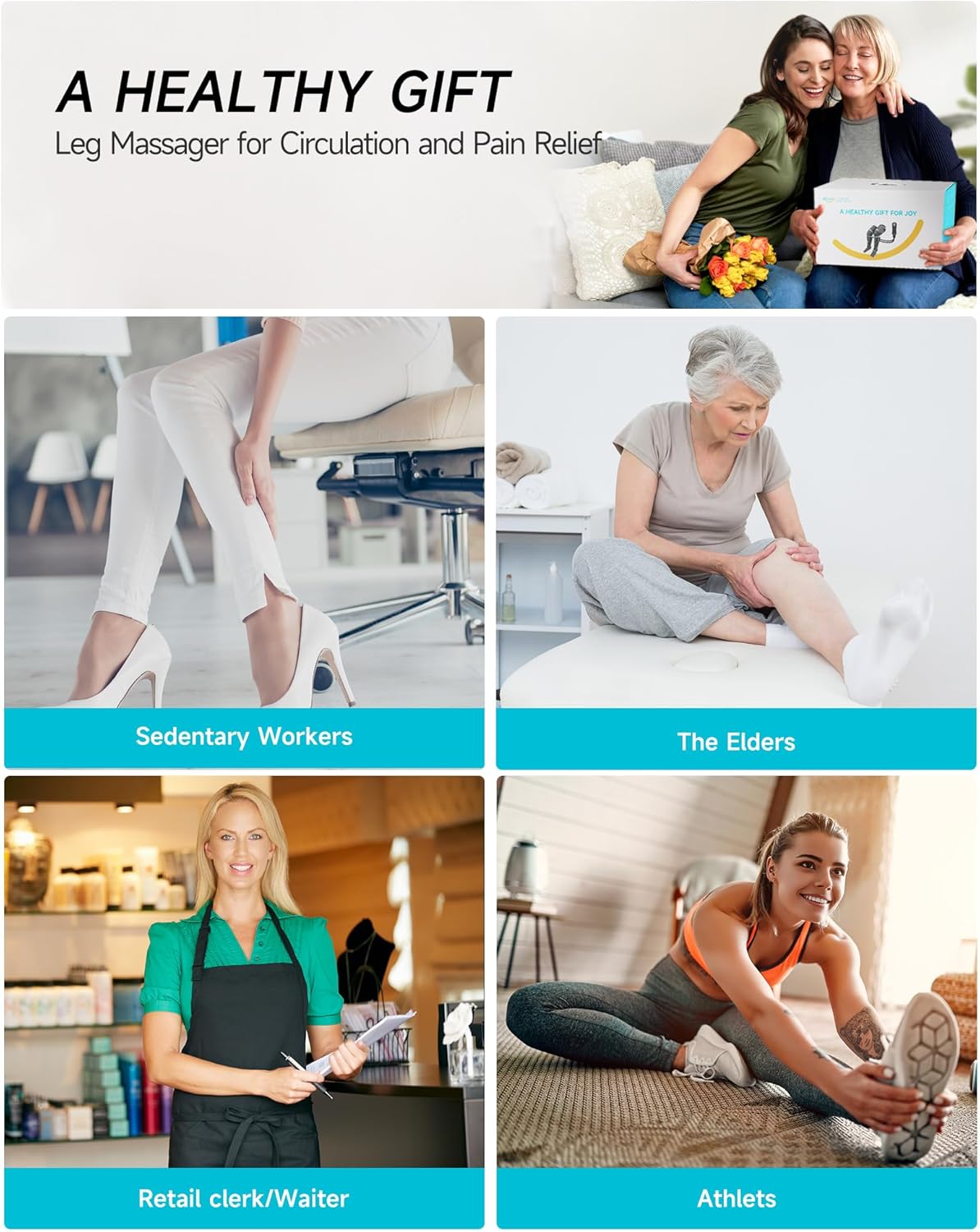 AIR COMPRESSION FULL LEG MASSAGER GIFT: Looking for a thoughtful health gift?Look no further than this leg massager. Compression technology is scientifically known to promote blood circulation, helpful for vericose veins, muscle fatigue, cramps, swelling and edema. Boasting 5 compression modes and 4 intensities, along with 2 heat levels specifically for foot and knee. Plus with 4 extenders for universal fit, making it ideal for athletes, nurses, teachers, rehabilitation patients, enior citizens